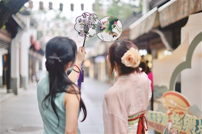 此外,多位身着旗袍、头戴簪花的市民也相约前来打卡。王女士说,她和朋友是专程前来赴“旗袍之约”的,在杭州中国丝绸城感受传统服饰的韵味,体验慢节奏的生活情趣,“很有意思”。