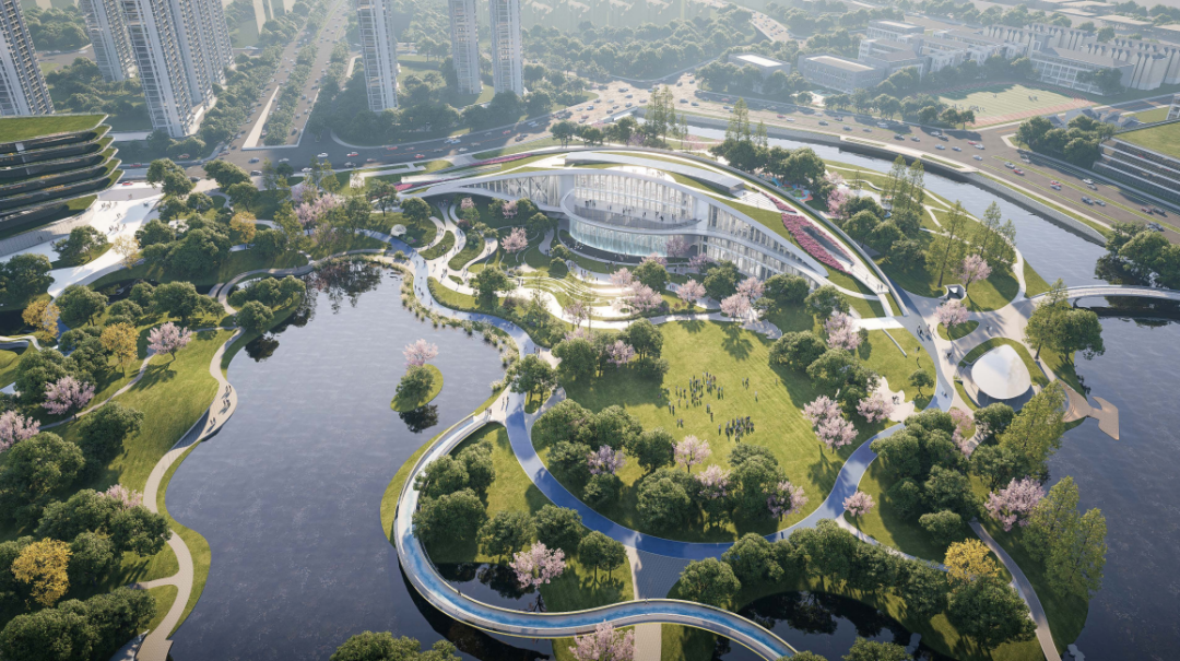 云眼位于访云街北侧、泊志路西侧,与云门公园其他景观和功能场所通过慢行系统连接成环,共同构建这片都市绿洲。其建筑设计汲取良渚文化元素,造型灵动活泼,兼具科技创新感与实用功能,与云门公园景观、水系有机融合,通过慢行游步道可通达公园各景点。目前正在加紧施工建设,预计2028年建成投用。