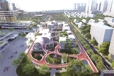 街区规划了1条长约1公里的红色空中跑道,串联起商业综合体、运动公园、美食街区、下沉广场和绿植庭院等多个功能空间,形成立体而连贯的公共空间体系,被称为“空中版天目里”。