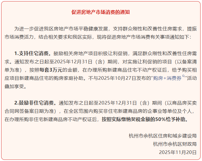 2025年11月20日至2025年12月31日(含)期间,购买实施让利促销项目新建商品住宅的购房家庭可享受每套3万元的购房补助,购买时间以新建商品房网签合同备案时间为准。不与2025年10月27日发布的“购房+消费券”活动叠加享受。
