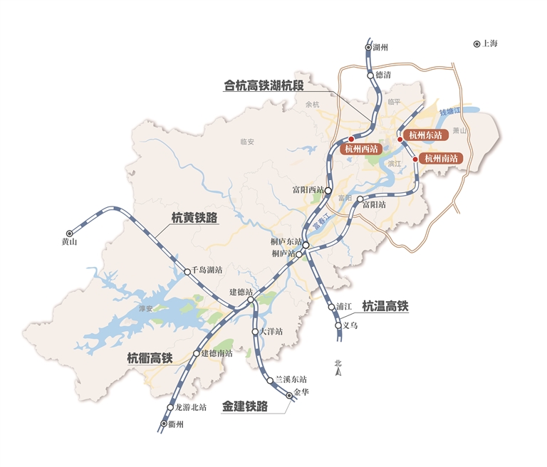 杭州南站出发:通过杭黄高铁与杭衢高铁无缝衔接,线路沿富阳、桐庐、建德方向延伸,接入杭衢高铁后途经龙游北站,直达衢州西站、江山站,比原沪昆高铁线路更快捷。