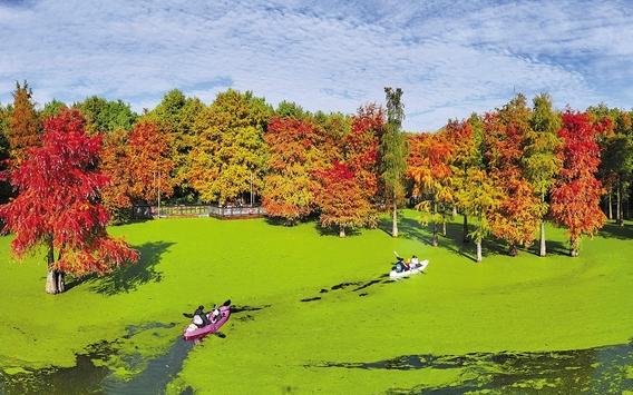 11月23日,临安区青山湖景区水上森林在初冬的阳光照射下,宛若打翻了调色盘,成为一处五彩斑斓的童话世界,吸引各地游客纷至沓来。这片位于青山湖北湖区的水上森林面积约5万平方米,生长着1万多棵池杉和落羽杉,大多杉树的根部常年浸入水下2米左右。水上森林的四季景色各有千秋,尤以冬初时节最为绚丽多彩。