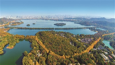 初冬时节的西湖边层林尽染,杨公堤上的悬铃木树叶泛黄,宛如一条金色腰带蜿蜒于湖畔。 记者 陈中秋 摄