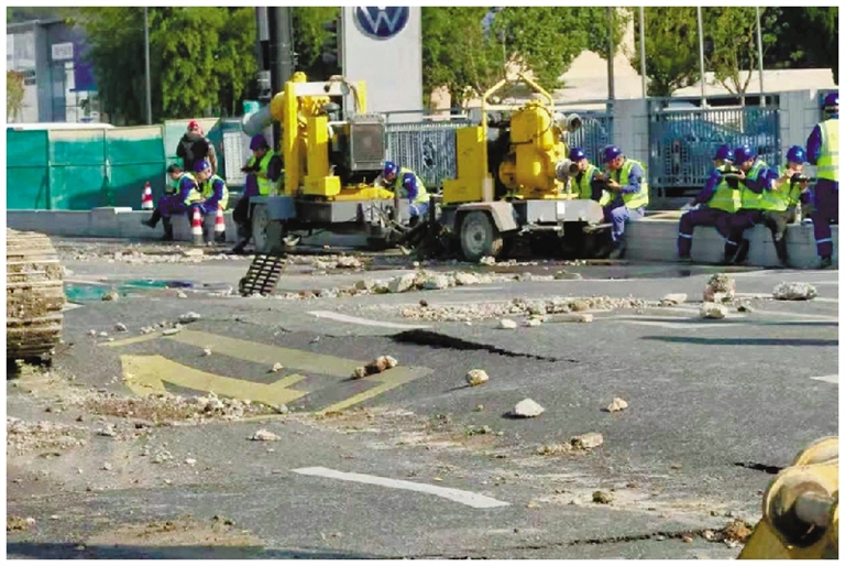 路面积水基本排除,工程车进场,开始对事发路段进行挖掘,以便后续的检测。市政、环卫等工作人员同步对路面泥沙、碎石、残余积水等进行清扫,一辆探地雷达检测车随后驶入现场准备作业。