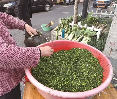 俗话说“小雪腌菜,大雪腌肉”,这段时间阳光充足,不少老底子杭州人开始腌制肉、菜。橙友“橙柿朋友”发帖晒出了街上腌肉的照片,“天气晴好,店家门口的铁架子上,挂满了腌制好的酱鸭酱肉腌鸡和手工制作的灌肠,酱香浓郁,色泽诱人,这些都是过年餐桌上的美味”。昨天下午,记者在闸弄口机神新村里看到,一位大伯在整理晒在地上的长梗白菜,把根部剪去,再用绳子捆起来。大伯说,这是早上刚买的,每斤一块二,他买了60多斤,已经晒了一天了,准备收回去,晚上腌起来。旁边几位大姐忙着把塑料盆里的雪里蕻剁碎,然后撒上盐进行腌制。一大盆足足40斤菜,每斤一块五,大姐准备了两包共600克的盐,用双手搅拌均匀后,塞到罐子里压实。一位大姐说,等上20多天就可以吃了,她最喜欢拿来烧面条,搭配笋、黑鱼片都很好吃。
