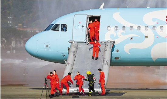 12月9日,杭州机场举行“杭安·2025”航空器应急救援综合实战演练。演练设置了航空器空中故障、人员救治与转运等15项科目,检验了跨部门协同与科技救援能力。图为机上人员进行紧急撤离演练。