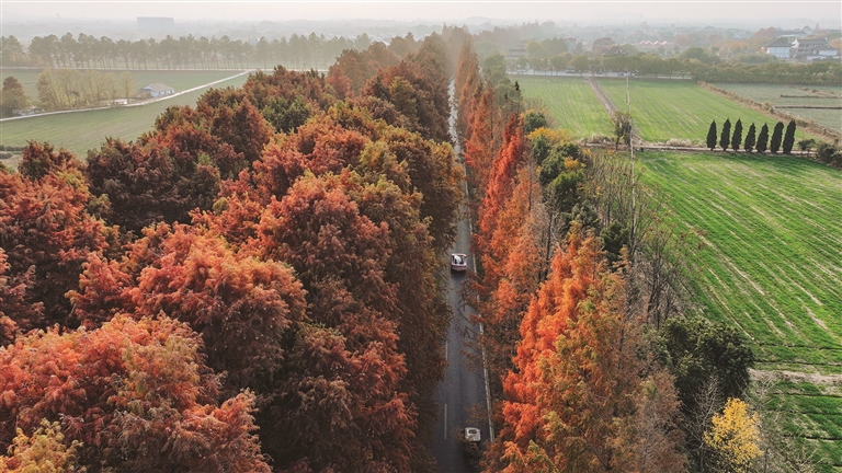 一棵棵高大挺拔的水杉被染上浓浓的橙红,倒映在如蓝如黛的水面上,美成一个焦糖色的童话秘境。近日,余杭区安上线尤其是港南村一带河岸两侧的水杉进入最佳观赏季。车行安上线,泛舟港南村,恰似画中游。