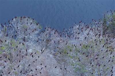 近日,在淳安县千岛湖东南湖区一座面积仅约5000平方米的无人小岛上,飞来了数以千计的鸬鹚,密密麻麻地停在灌木枝头或浅滩。鸟群上空,一只老鹰长时间盘旋守望。