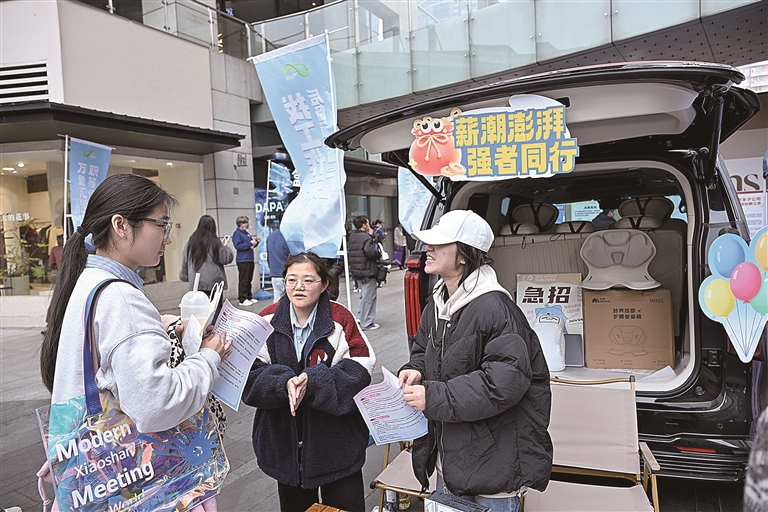 近日,万象汇街区上演了一场别开生面的招聘会:十余辆私家车整齐停靠,后备箱敞开,化身为一个个精致新潮的“招聘站”,吸引数百名青年驻足咨询,现场氛围轻松而热烈。