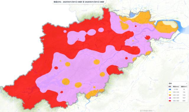 2025年,全市降雨量1409.2毫米,较多年平均值偏少12.7%,区县降雨量最大为淳安1482.5毫米,最小为钱塘区1196.1毫米。降雨总趋势由西北向东南递减。