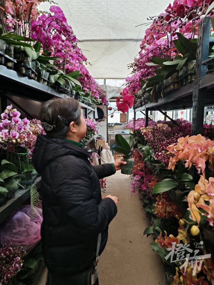 30多岁的胡女士和老公鲍先生正在“景瑟花店”的蝴蝶兰货架旁精心挑选心仪的花株。胡女士说,过年前她都会来这里买鲜花,已经有5年了,一般都是买蝴蝶兰和冬青,过年嘛,家里摆上鲜花会更喜庆。蝴蝶兰花期长,能开好几个月,现在买一直到过年都会很好看的。“蝴蝶兰对温度和湿度要求还是很高的,我的养花水平不算好,平时上班也忙,对花管得也少,可能是水浇多了容易烂根,我的同事就很会养,她养的蝴蝶兰第二年还会复开花,我很羡慕,我就只能每年重新买,家里大大小小的花盆已经存下来很多,大花盆能种八到十株蝴蝶兰,小花盆能种二三株。昨天,我们带了3个小花盆来试试,看看能不能只买花,花盆用自己的,这样就能省下买花盆的钱。”