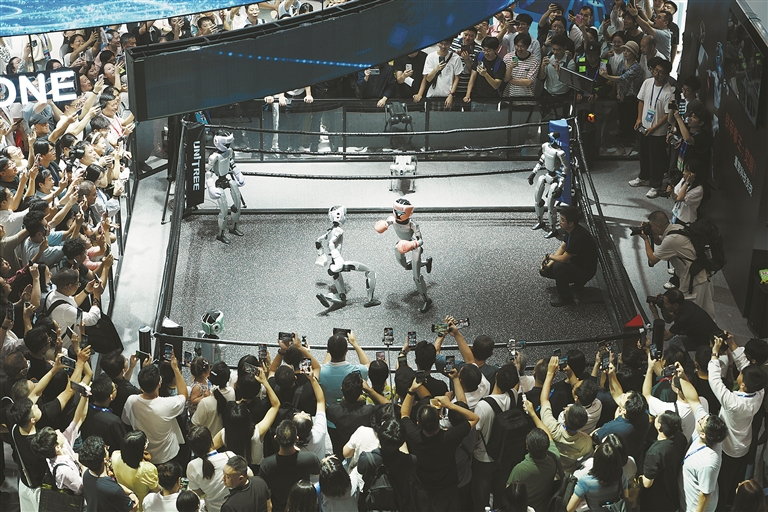 宇树科技的人形机器人在擂台上灵活闪避、动作利落,现场响起一片惊叹和掌声。记者 王毅 摄