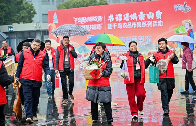 戴着党徽跑市场,城乡互动架桥梁。2018年末,淳安县枫树岭镇组织28个村的村书记“拧成一股绳”,肩扛锄头、怀抱南瓜、手拎酒坛,开着40多辆满载60多种山货的车来到杭州运河广场,在杭城刮起“杭儿风”。此后的8年,这一活动不断迭代更新:2023年,“书记进城卖山货”扩大到淳安全县,淳安县23个乡镇“书记总动员”,村书记、乡镇书记、各局委办书记,甚至县委书记等,共有超过100名书记参与到活动中,山货种类也越来越丰富;随后还增加了新农人群体——“千岛农客”,引入了潮流玩法“山货盲盒”;邀请书记们参加“中国年·年货节”等等。