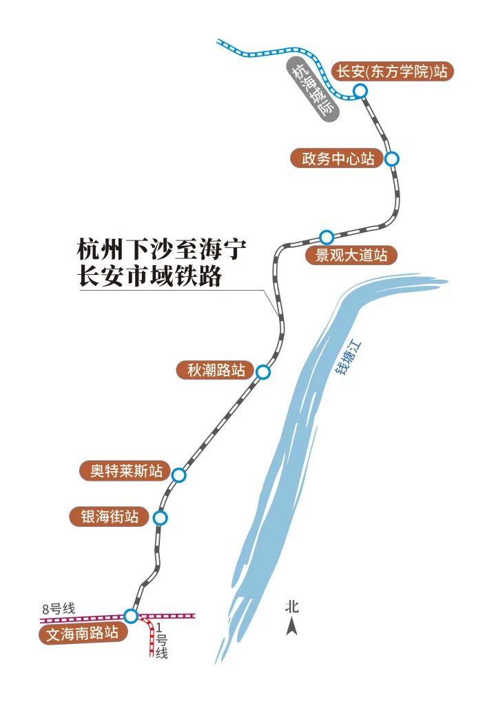 该线路南起已经投入运营的杭州地铁1号线、8号线换乘站文海南路站,北至杭海城际铁路的长安站,设计时速为120公里。建成后,将极大促进杭海区域一体化发展。