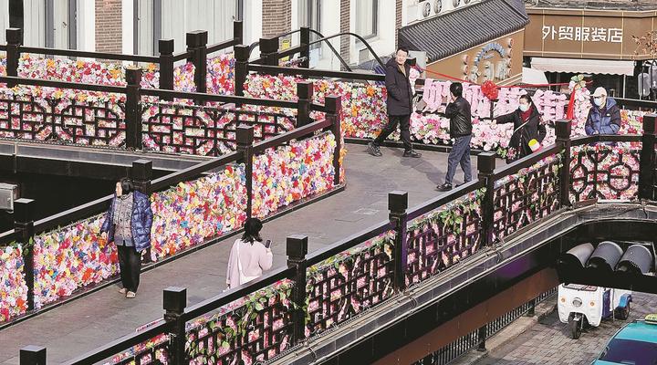 杭州日报讯 新春的脚步渐近,杭州上城区解放路与中山中路交会处的解放路人行天桥,已悄然换上“花衣”。天桥两侧,72块缤纷花板整齐悬挂,1.5万余朵仿生花与手工绒花绚烂绽放。行人漫步其间,宛若穿行于春日花廊,满眼皆是浪漫与生机。