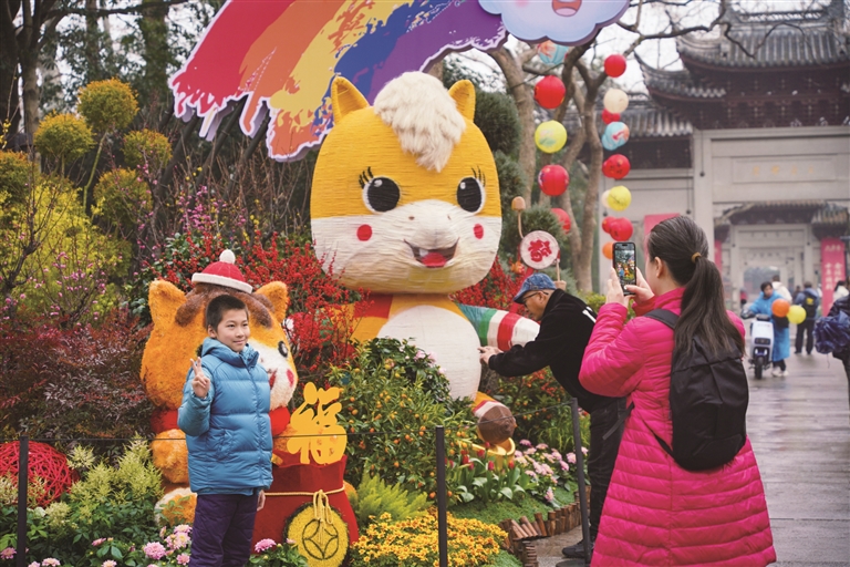 这几天,钱王祠靠近南山路的一处马年门头火了。据悉,2026年西湖迎春花展将于2月中旬在钱王祠开幕,目前南山路上的花展门头已基本成型。门头以五匹形态各异的生肖马为视觉主体,小马们有的怀抱福袋,有的捧着写着“春”字的小鼓,还有几匹戴着各种萌趣小装饰,喜庆可爱,福气满满,吸引很多过往游客驻足打卡。