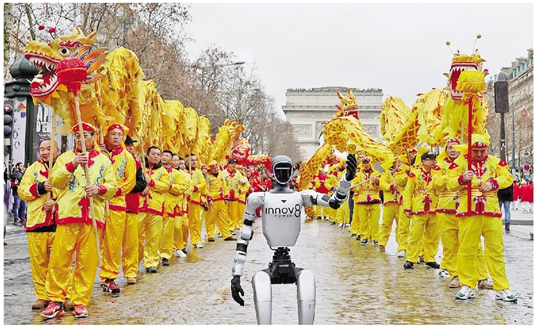 2月1日,在法国首都巴黎的香榭丽舍大街,由宇树科技及其法国代理INNOV8集团提供的机器人参加巡游活动。 新华社记者 张百慧 摄