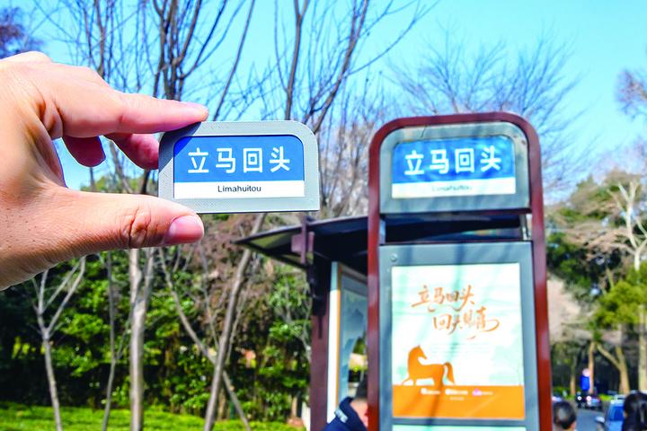 这段“解说”也被做成标识牌,立在“立马回头”公交站牌旁,成为杭州少见的自带“解说百科”的公交站。如今,这里又设立了“立马回头,回头见喜”主题打卡亭牌,镂空的骏马后面是大片的茶田和葱茏的植物,站台还带上了slogan:立马回头,回头见喜。