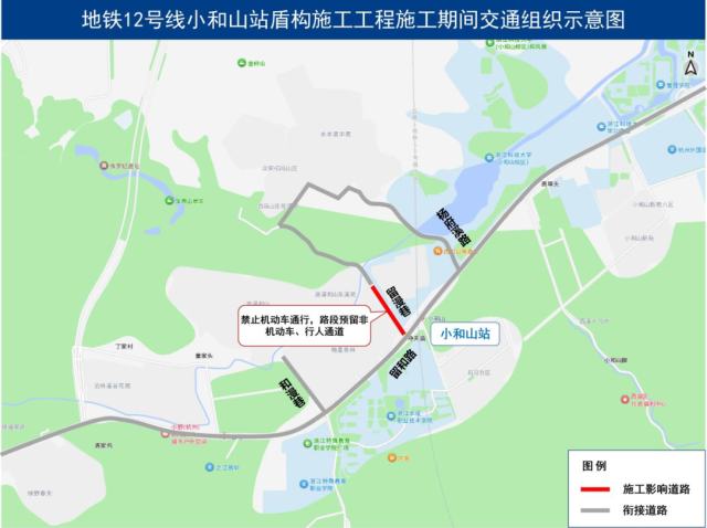 三、2026年2月11日至2027年5月11日,地铁12号线小和山站盾构施工工程范围内的留和路(纵十五路北侧—留漫巷南侧)、留漫巷(留和路—翰墨香林苑东侧消防出入口)、将占用部分道路空间施工。施工期间,留和路(纵十五路北侧—留漫巷南侧)维持双向6车道通行不变,留漫巷(留和路—翰墨香林苑东侧消防出入口)调整为禁止机动车通行,非机动车、行人在预留通道内通行,受限机动车请绕行和漫巷、杨府溪路等周边道路。