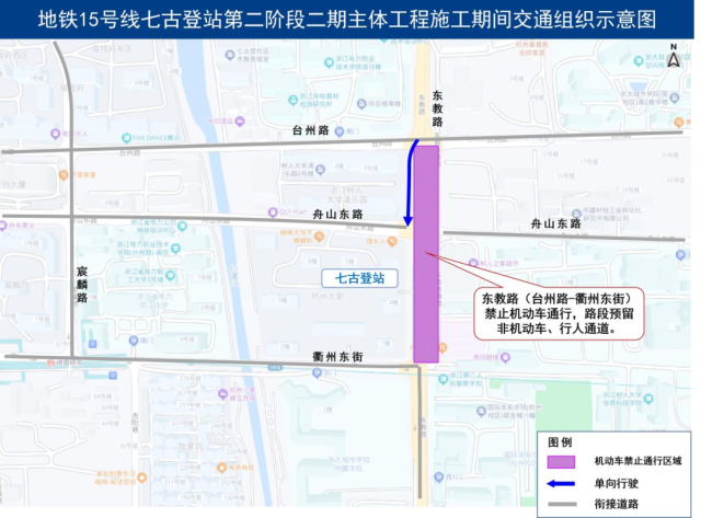 一、2026年2月10日至12月10日,地铁15号线七古登站第二阶段二期主体工程范围内的东教路(台州路—衢州东街)将占用部分道路空间施工。施工期间,东教路(台州路—衢州东街)禁止过境机动车通行,路段预留非机动车、行人通道,受限机动车请绕行衢州东街、宸麟路、台州路等周边道路。