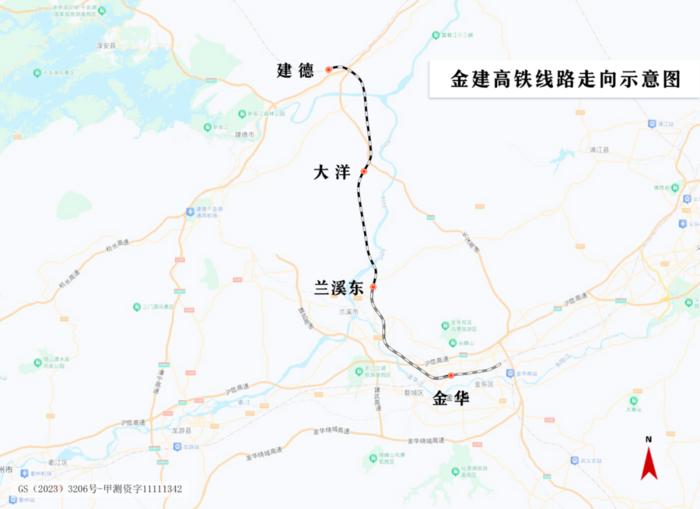 金建高铁起自金华市金东区,向北经兰溪市、建德市,在建德站接入杭昌高铁杭黄段,正线全长64.51公里,设计时速250公里。沿线设金华、兰溪东、大洋、建德4座车站,其中兰溪东站和大洋站为新建车站。