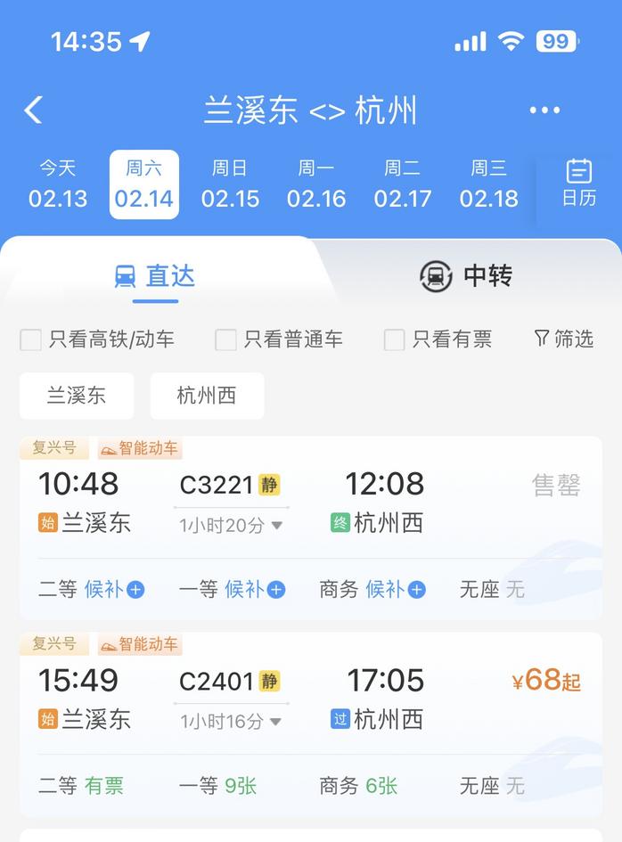 截至14时35分,明天兰溪东至杭州西的首发列车C3221次所有车票已显示售罄。
