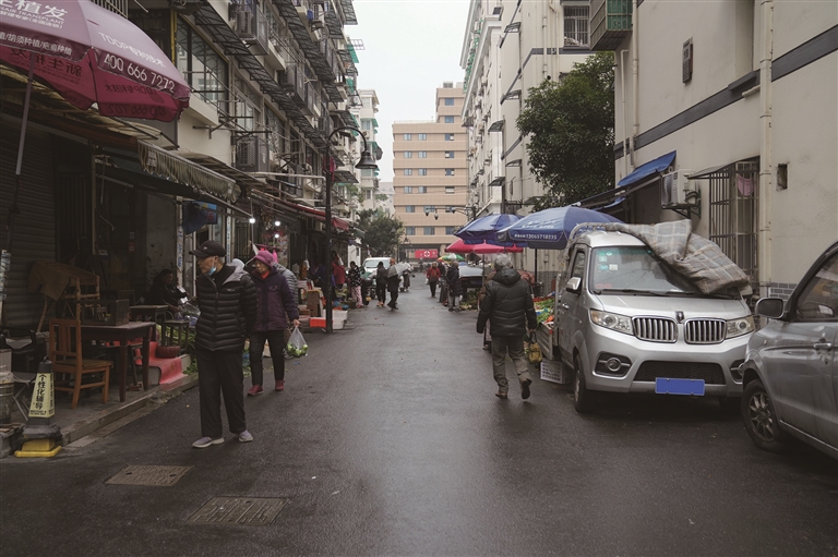 我们到的这天飘着小雨,从巷子的最北端进去,两旁是撑着伞买菜的街坊邻居,有些人站在屋檐下闲聊几句,腊货摊支在遮阳伞底下躲雨,腊货没那么多,但也足够烘托出过年的氛围了。