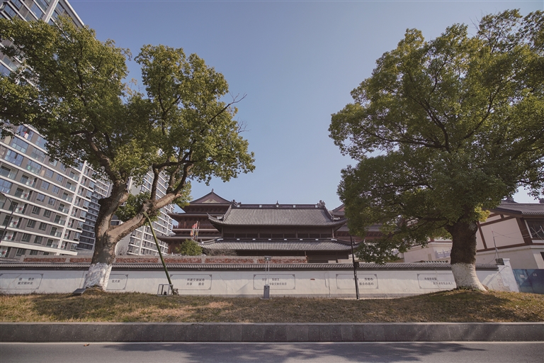 在南落马营区块,城市面貌日新月异。记者在附近走上一遭,最让人感到惊喜的莫过于“海潮寺复建”。在钱学森学校对面,一群明代风格显著的庙宇建筑错落有致地分布其间,机器的轰鸣声从庙宇中不断传来。这里,便是杭州海潮寺(处所)复建工程所在地。