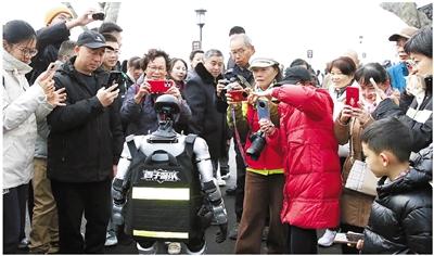 值得一提的是,今年断桥还迎来了一位特殊的管理人员——它是一位圆头圆脑的人形机器人,身着定制款“西子警队”执勤马甲,名字叫“断桥小白”。当客流出现拥堵苗头时,它会主动站到关键点位,清晰提醒游客有序通行、注意安全;它还会用憨态可掬的动作向游客拜年,引得许多游客纷纷与它互动合照。