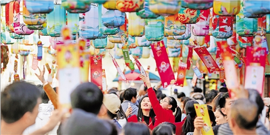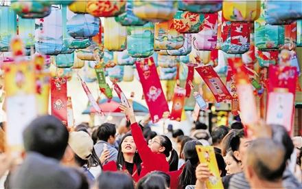 2月21日,杭州市余杭区瓶窑老街年味浓郁,市民和游客驻足观赏非遗演出、参与猜灯谜活动,沉浸在节日的喜庆氛围中。