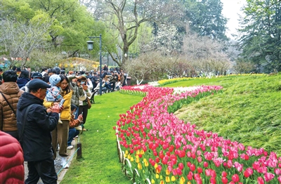 西湖区的春日绿意同样动人。省府路的“一路生花”也到了最佳观赏时间,粉色的郁金香和紫罗兰开得正盛,这条48米的“花路”吸引不少路人驻足拍照。