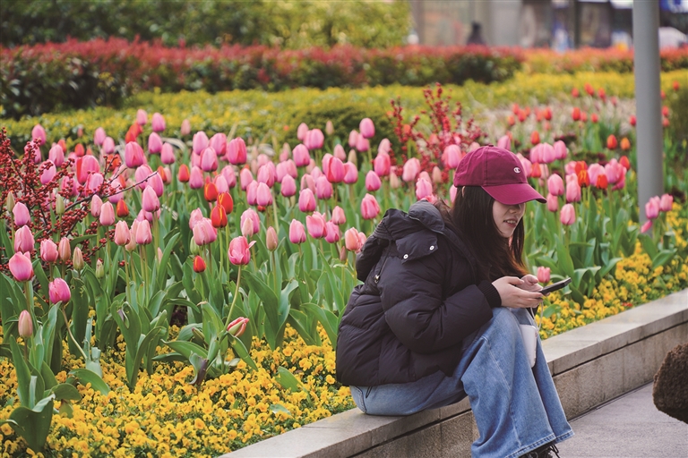 昨天,在嘉里中心附近,郁金香绚丽绽放,遍布广场和路边,宛如一幅流动的春日画卷。摄影 商报记者 项凯