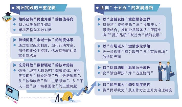 始终坚持“民生为重”的价值导向。聚焦群众“急难愁盼”,将“民之所盼”转化为“政之所向”,是公共服务的价值出发点与落脚点。多年来杭州市委、市政府始终锚定“人民城市为人民”这一城市建设和治理的逻辑起点。这种价值取向具象化为两条硬约束:一是财力优先向民生倾斜——持续多年坚持将一般公共预算新增财力超三分之二投向民生领域,“十四五”时期累计安排财政资金639亿元、高质量办好民生实事144项;二是考核严格向实效对标——持续多年实施民生实事项目,并强化责任分层分类推进机制,实时研判项目实施的进度、质量、效果,切实把实事办好、办到群众心坎上。可以说,这种“把政绩写在群众笑脸上”的鲜明导向,有效遏制了民生领域的“形象工程”与“福利冲动”,形成了尽力而为、量力而行的良性发展格局。