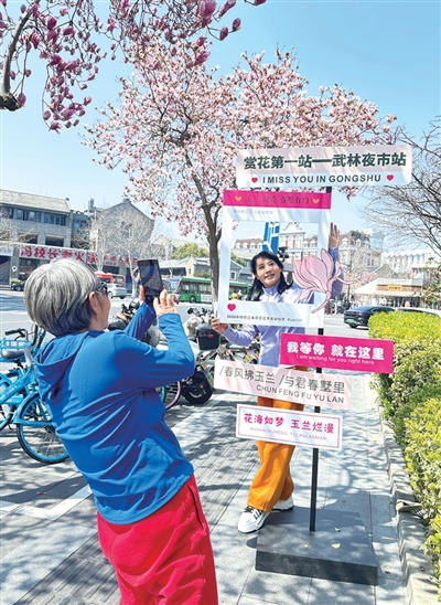 游人在玉兰树前拍照打卡