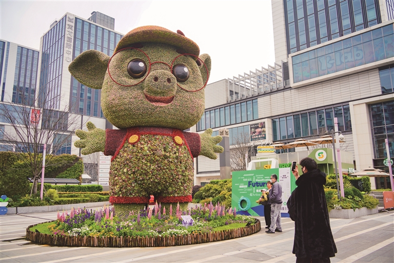 昨天,杭州西湖区文三路与学院路交叉口处,一只换上新装的网红立体花坛“福气猪猪”,吸引不少市民游客驻足观赏、拍照留念。 这只小猪披着由20多种共计88000余株多肉组成的“新衣”,身穿绿色“背带裤”,头戴“小黄帽”,造型清新治愈,已成为春日里一道亮丽的风景线。
