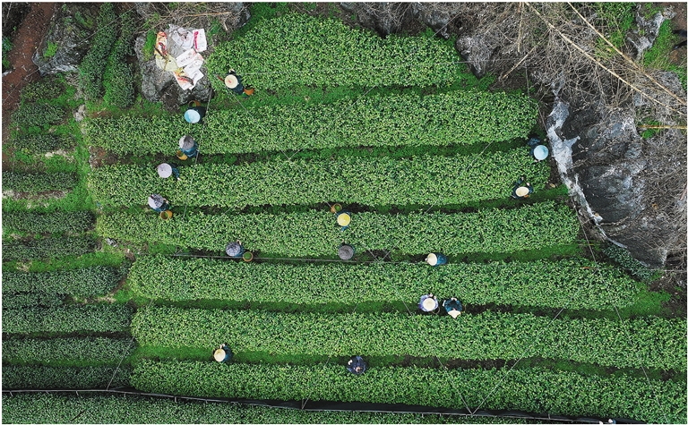 “我们这片茶山朝北,温度光照适宜,水汽也充足,加上勤浇水施肥,所以发芽较早。”茶农沈生荣家有10余亩茶地,今年招了12名采茶工,其中来得最久的已经干了17年,“大家相处得像亲人一样”。采茶工们通常早上6点开采,一直忙到晚上6点。上午10点,她们第二篓鲜叶已装了一小半。沈生荣轻轻捧起碧绿的茶叶说:“现在采摘的是明前茶,芽尖饱满、口感清甜,会一直采到清明。”