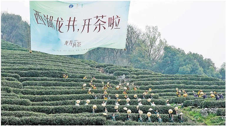 本次开茶仪式以整片茶山为实景舞台,氛围感拉满。来自核心产区10个村的100位茶农,携手浙江音乐学院舞蹈学院学子,联袂演绎采茶舞——指尖轻捻、身姿灵动,悠扬茶歌萦绕山谷,人与茶、舞与山交融,尽显茶乡丰收气象。现场,更有“90后”“00后”新生代茶人,以直播连线形式向世界传递西湖茶韵。