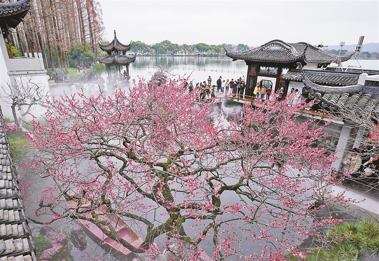 西湖曲院风荷景区湛碧楼附近的梅花盛放时,吸引了众多市民游客前往观赏打卡。 记者 法鑫 摄(资料图片)