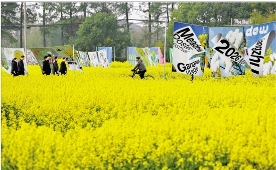 3月20日,“良渚花浪海报季”在杭州市余杭区良渚街道港南村举行。270余幅中国美术学院毕业生的精选海报作品置于油菜花田中,田野变身一座“没有围墙的美术馆”。