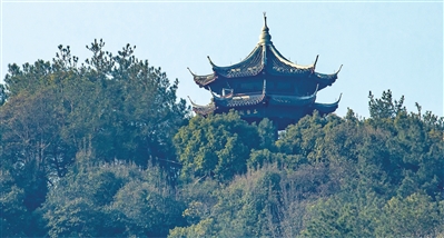 山顶的三台阁,最早出现在明代周龙所绘的《西湖全景图》上,明崇祯年间所刊的《天下名山胜概记》中的《西湖全图》上有更清晰的描绘。原阁久废,2004年重建,是一座两层八角重檐建筑,高19.5米,登上二层,极目远眺,山峦叠翠,碧湖如镜,西湖全景可尽收眼底。