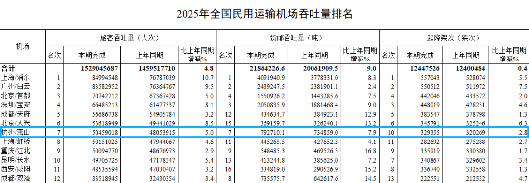 民航局官网最新数据显示,杭州萧山国际机场的旅客吞吐量、货邮吞吐量,已双双反超上海虹桥机场。