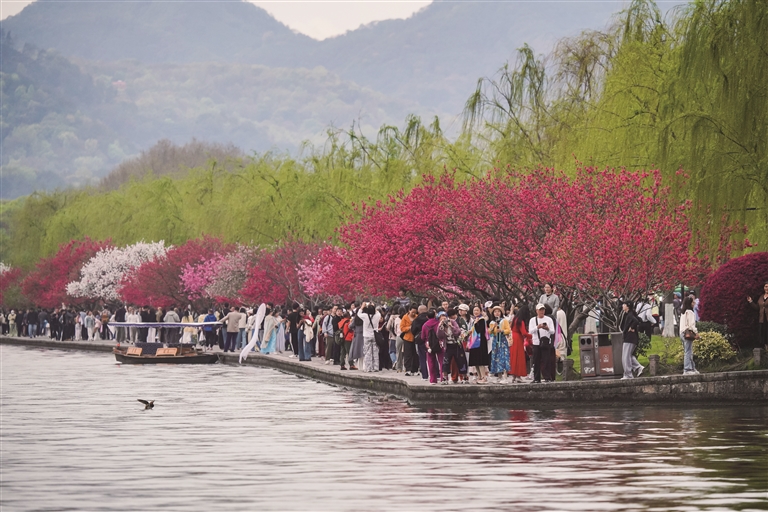 “西湖景致六吊桥,一株杨柳一株桃。”3月底到4月初,正是这番西湖盛景的最佳观赏期。昨天,西湖白堤上,碧桃花开灼灼,红霞般的花团缀满枝头,与随风摇曳的嫩绿柳枝相互映衬,展现出“间株杨柳间株桃”的经典画卷,吸引市民游客纷纷驻足打卡。