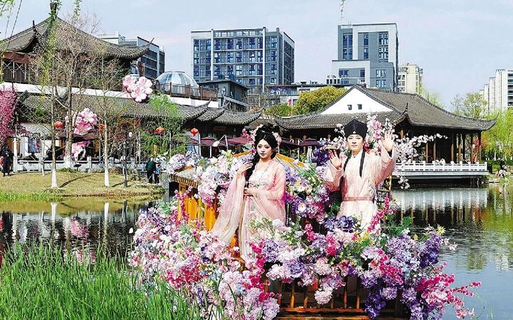 日前,上城区丁兰街道的千桃园景区里,30余个品种的7000多株桃树进入盛花期,每天吸引不少市民游客前来“赴千桃之约,悟孝善初心”;而在与千桃园相距约4公里的桃花湖公园里,1000余株桃树也花开正艳,还有衣袂飘飘的“花神”在湖上泛舟、花间巡游;就连串联起这两处观桃美地的华鹤街、临丁路沿线及上塘河沿岸,也都被盛开的桃花、樱花、海棠花等一路相拥,宛如在皋亭山脚下铺展出一幅绵延十里的江南春日画卷。