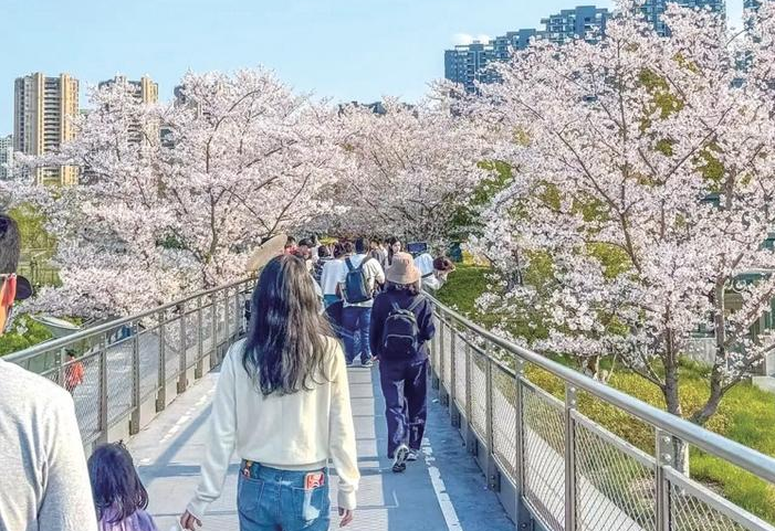 眼下,拱墅运河体育公园里的天桥,已经成为杭州赏樱的好地方。500米长的天桥两侧,种了100多株染井吉野樱,树冠交织在一起,像撑起了一片粉白色的穹顶。