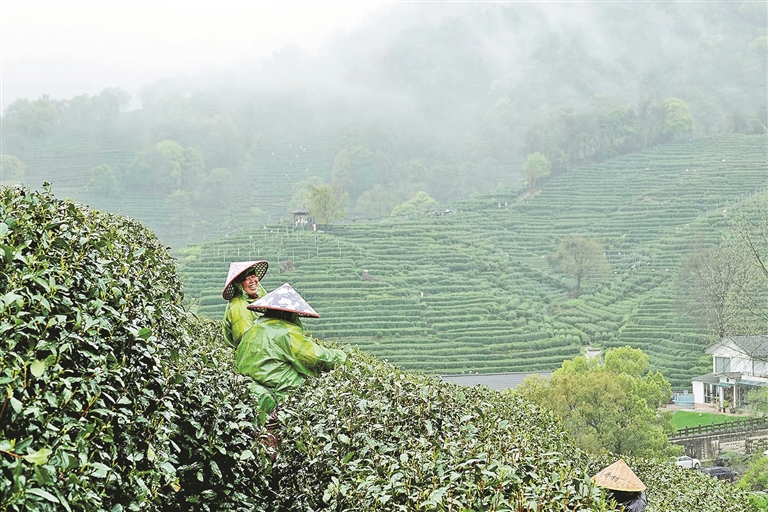 4月3日,在杭州西湖景区龙井村的茶园里,大批采茶工冒着大雨抢摘西湖龙井明前茶。西湖龙井茶历来以明前茶为贵,随着清明节气临近,龙井茶乡的茶农、采茶工、炒茶工们风雨无阻、昼夜轮班,加紧采摘、炒制品质优良的西湖龙井明前茶,将辛苦劳作融入每一杯清香甘洌的茶水里。