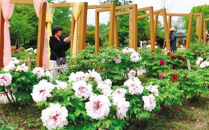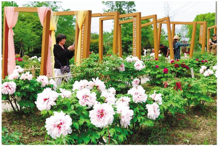 据了解,普宁村牡丹公园整体占地超2.5万平方米,种植了岛锦、二乔、玉楼春、绿幕、大富贵等30多种牡丹,花期最长可持续到4月下旬。活动现场设有共富市集、亲水游步道、童趣游乐园等供市民游客打卡留念。