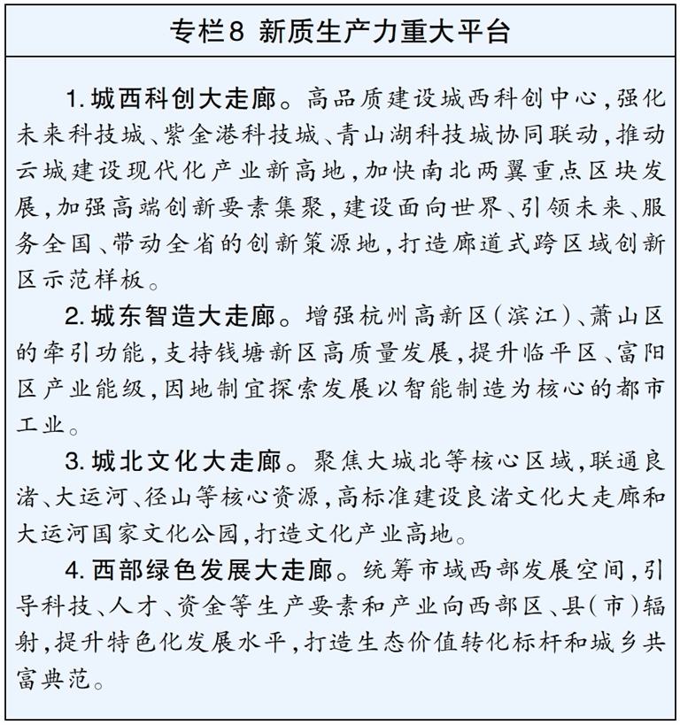全面推动产业创新廊带联动布局,构建源头创新在极核、场景应用在全域的新质生产力网架。做优武林湖滨地区、钱江新城和钱江世纪城金融服务、文化交往、高端商务等核心功能,做强余杭城市新中心以科技创新为特色的核心功能。推动城西科创大走廊高质量融合发展,充分发挥城东智造大走廊的工业主战场作用,打造以“数智+文化”为特色的城北文化大走廊,推动西部绿色发展大走廊拓展绿水青山向金山银山转化通道。