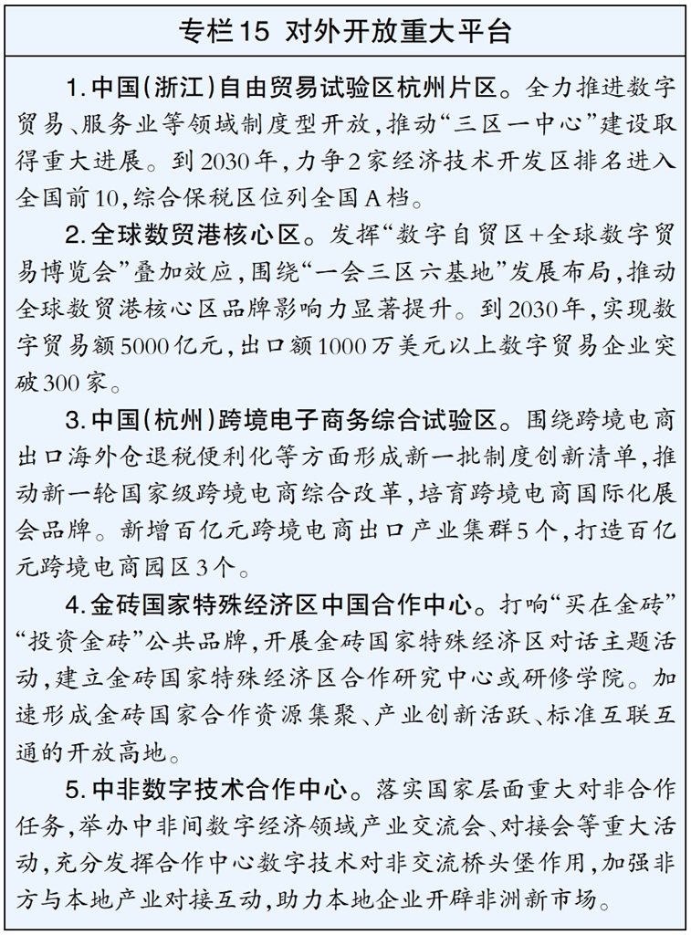 做强数字文化、影视传媒、动漫游戏、创意设计、现代演艺等优势产业,培育发展文化装备智造、沉浸式文旅等新业态新模式,推进国际动漫之都、电竞名城、全国版权示范城市建设。高标准建设良渚文化大走廊,提升之江文化产业带能级,做强国家(杭州)短视频基地等国家级文化产业平台。支持龙头文化企业全球布局,孵化一批一流文化企业。实施文化“新三样”出海专项行动,全力打造全国乃至全球“新三样”高质量发展新高地和全国文化“新三样”出海引领地。到2030年,全市规模以上文化企业营业收入力争超1.4万亿元。