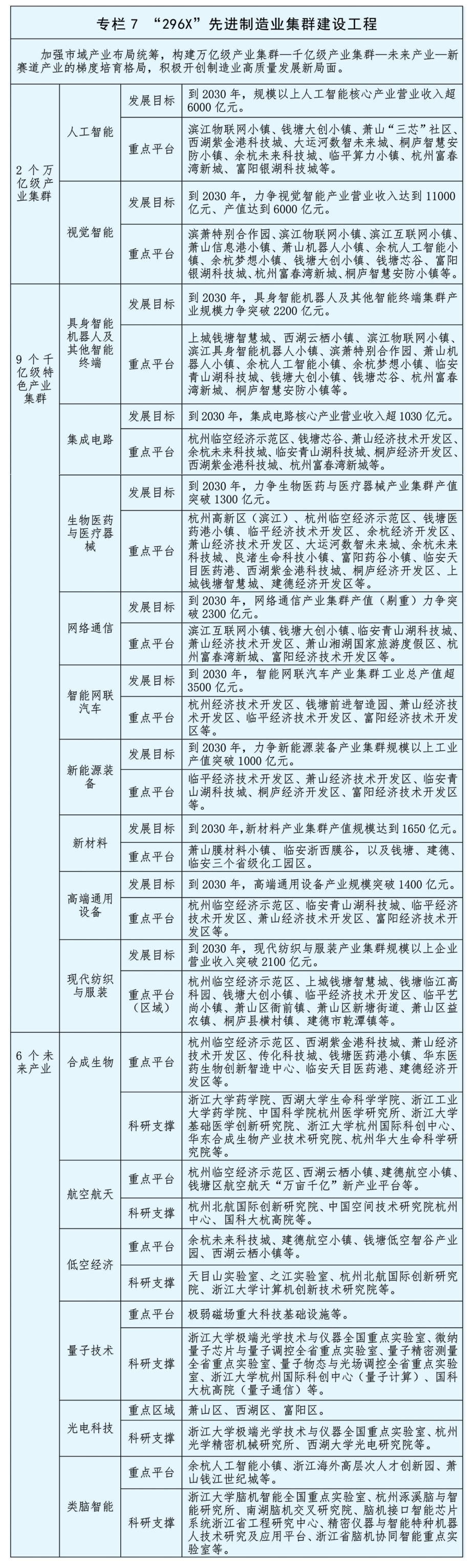 加快打造人工智能、视觉智能2个万亿级产业集群,积极争创人工智能国家级先进制造业集群,推动视觉智能产业集群向世界级集群迈进。聚焦具身智能机器人及其他智能终端、集成电路、生物医药与医疗器械、网络通信、智能网联汽车、新能源装备、新材料、高端通用设备、现代纺织与服装等9个领域,打造千亿级产业集群。建立未来产业投入增长机制和前沿颠覆性技术预见性机制,聚焦合成生物、航空航天、低空经济、量子技术、光电科技、类脑智能等“6+X”个未来产业集群,探索多种技术路线、典型应用场景、可行商业模式、市场监管规则,布局一批未来产业先导区。提升信息技术服务、生物医药国家级战略性新兴产业集群发展能级。协同共建环杭州湾现代纺织服装、浙东工业母机等国家先进制造业集群。到2030年,制造业结构进一步优化,规模以上工业增加值达到6200亿元。
