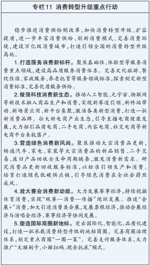 ——新业态新模式新场景发展实现重大突破,成为引领全国的消费转型升级高地。融入服务全国统一大市场建设纵深推进,消费对经济发展的基础性作用和拉动作用显著增强,优质消费供给更加充足,促进消费制度机制更加完善,现代商贸流通体系更加健全,内外贸一体化发展格局全面形成,国际“赛”“会”之城建设持续深化,对全省全国消费的引领带动作用更加明显,社会消费品零售总额力争达到1.2万亿元。
